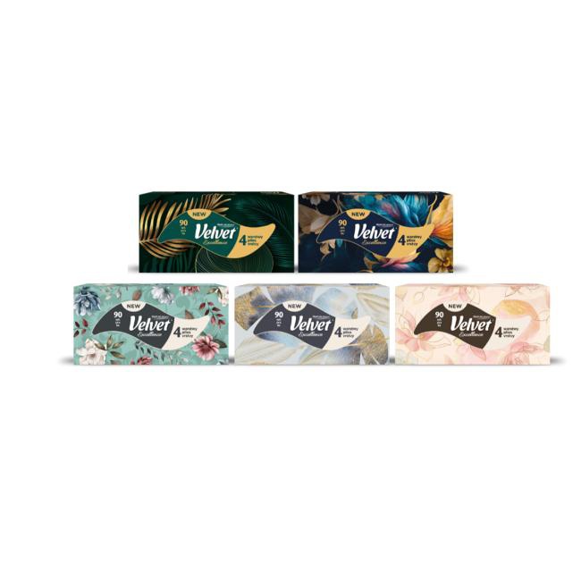 Elegancia, luxus a extra starostlivosť je ukrytá v novinke Velvet Excellence. 90 ks jedinečných, štvorvrstvových kozmetických obrúskov, ktoré sú výnimočne delikátne, napriek tomu dostatočne pevné. Vreckovky ponúkajú extra starostlivosť o pleť a nadčasové, prémiové designy. 4 vrstvy, 90 útržkov, 100% celulóza