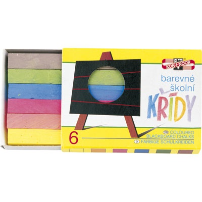 Farebné kriedy na školské tabule. Rozmery 12 x 12 x 100 mm. Dodávané v sade 6 farieb (žltá, oranžová, karmínová, tmavomodrá, tmavozelená, hnedá). Väčšie balenie 40 sád.