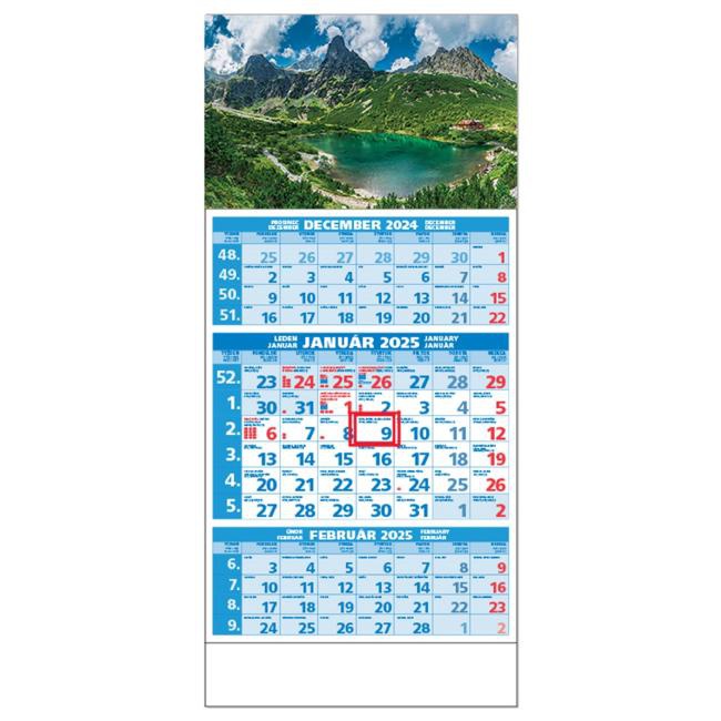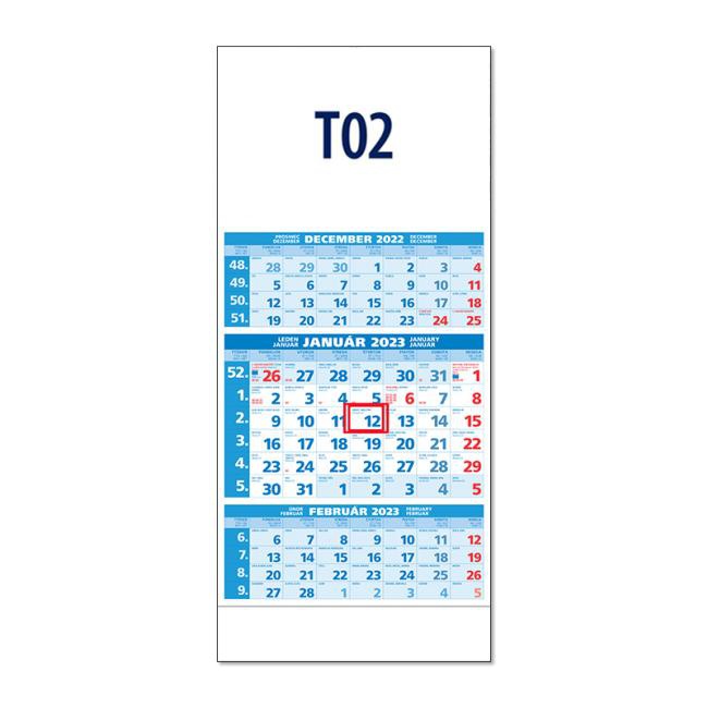 Plánovací 3-mesačný modrý kalendár s priloženou hornou čistou lištou, s menami v SK + CZ, názvy mesiacov a dní v SK, CZ, UK, DE a HU.