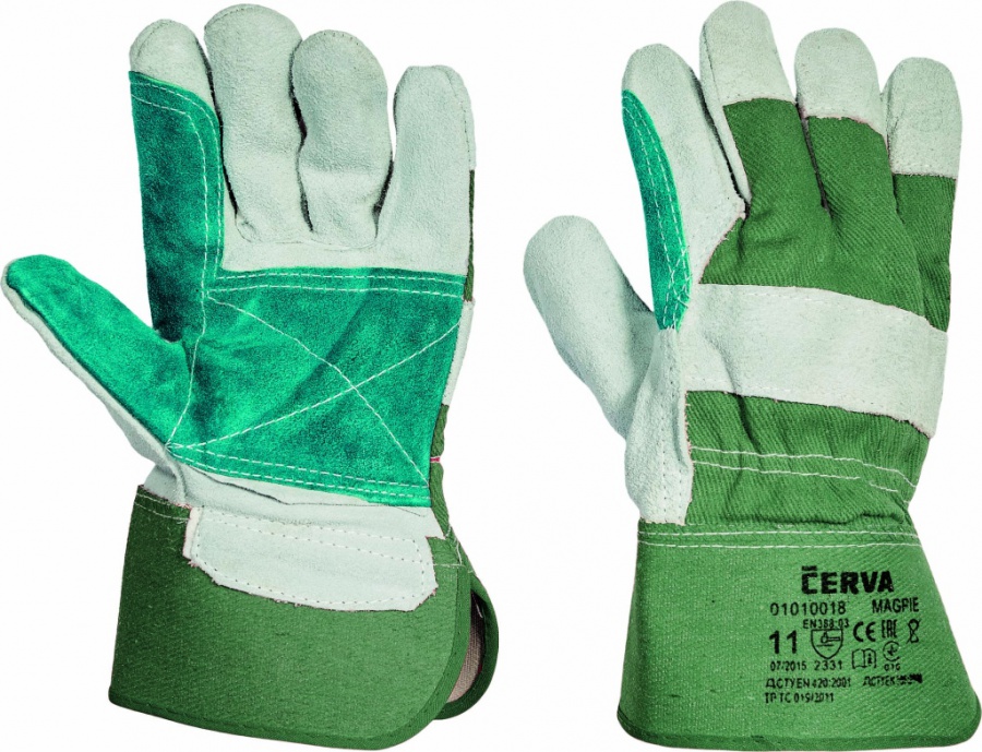 Rukavice z hovädzej štiepenky s podšívkou a zosilnenou vrstvou v dlani • z bielej bavlnenej tkaniny na chrbte • s pevnou manžetou
