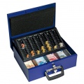 Uzamykateľná pokladnička s tvarovaným úchytom, plastovou priehradkou na mince a 2 kľúčami....