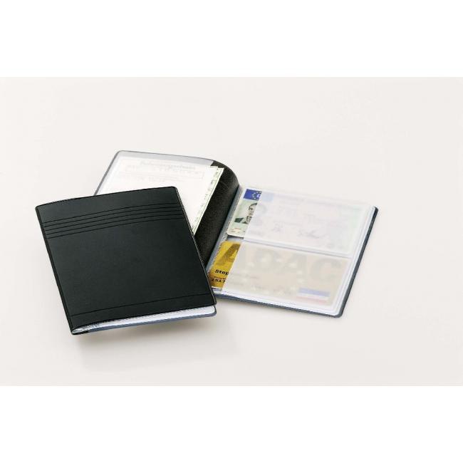 Puzdro so zatavenými priehľadnými vreckami na 4 platobné karty rozmerov 54×85 mm a 4 preukazy max. rozmerov 80×115 mm (technický, vodičský alebo občiansky). Farba čierna.