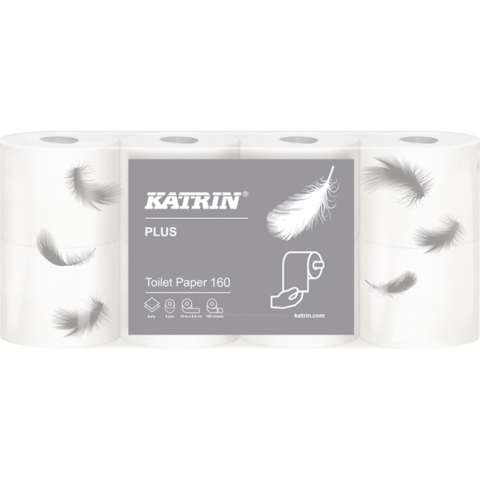 Vysoko kvalitný toaletný papier Katrin 160. - 2-vrstvový, biely - Extra jemný - Navrhnutý špeciálne pre hotely - Počet útržkov156ks v rozmere 117x92 mm - Návin 1 kotúčika 18m - Priemer dutinky 44mm - Obsah balenia 8ks