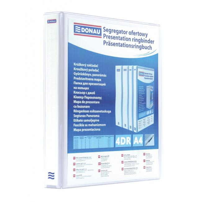 Prezentačný 4-krúžkový zakladač A4 s D-krúžkovým mechanizmom, dvomi vreckami na vonkajších aj vnútorných krytoch a jedným vreckom na chrbte.. Vyrobený z kartónu s hrúbkou 2,4 mm a gramážou 1400 g/m², potiahnutý z oboch strán ekologickou polypropylénovou fóliou. Krúžkový mechanizmus: 4 RD, vzdialenosť medzi krúžkami: 80 mm, priemer krúžku: 65 mm. Farba: biela Šírka chrbta: 100 mm Rozmery: 295 x 315 x 97 mm Formát: A4